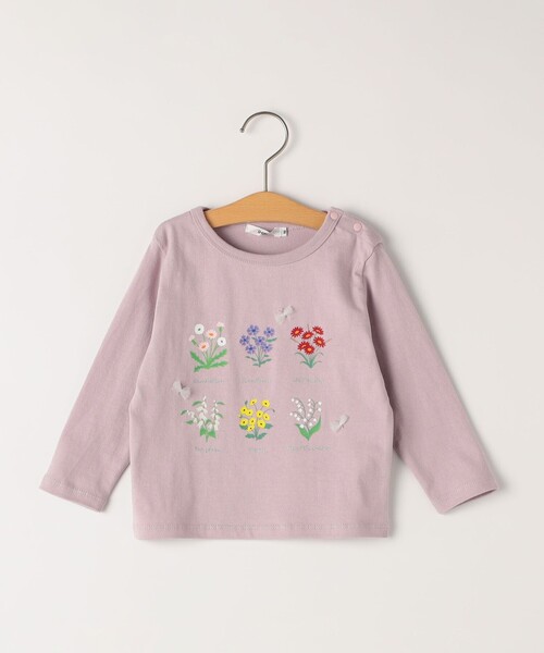 お花図鑑をモチーフにした、春ムードたっぷりな長袖TEE 【素材特性】 柔らかく肌触りの良い綿100%の40/2天竺を使用し、着心地も抜群! 毛羽立ちの少ないソフトな風合いでデイリーユースにピッタリです。 【デザイン】 あたたかみのあるタッチで描かれた6種類のお花モチーフがキュートなデザイン。 蝶々を立体感のあるシフォンに見立てた、アクセントの効いた遊び心溢れる一枚です。 お花の名前をキラキラしたグリッターで描いたのも女の子心をくすぐるポイント♪ 80,90cmサイズのみ肩釦つき。 【スタイリング/シーン】 パンツやキュロットと合わせたカジュアルスタイルにも、スカートと合わせて上品にまとめたお出かけスタイルにもおすすめ◎ 女の子が大好きなかわいい要素がたっぷり詰まった、一枚で着映えする主役級のアイテムです。 【対象カテゴリー:ベビー/BABY】 【注意事項】 ※末永く愛用頂く為に、アテンションタグ・洗濯ネームを必ずご確認の上、着用又はお取り扱いください。 ※撮影環境による光の当たり具合やパソコン・スマートフォンなどの閲覧環境によって、実際の色味と異なって見える場合があります。 あらかじめご了承ください。商品の色味は商品単体で撮影した画像をご参照ください。