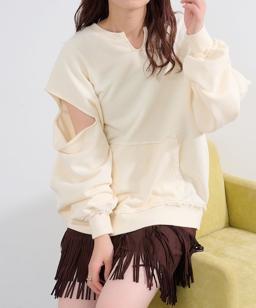 こなれ感抜群の主役級スウェットPRE ORDER 1.17 FRI 12:00 STARTお気に入りマークを押して販売開始までお待ちください。■デザインカットアウトのディテールが特徴的なBIGスウェット。肩や袖に大胆なスリットが入ることで、ラフさの中にもモードな雰囲気を演出してくれます。フリンジ加工がこなれ感をプラスし、カジュアルながらも個性的な印象の一枚です。■生地感柔らかな肌触りと程よい厚みが特徴です。通気性と耐久性を兼ね揃え、長時間でも快適に着用していただけます。■コーディネートシンプルなボトムスとあわせることで、スウェットの存在感を引き立てます。足元はショートブーツやスニーカーでカジュアルに仕上げたり、ヒールでフェミニンさを加えるのもオススメです。■素材・洗濯表示素材:【本体】コットン73%,ポリエステル27%【リブ】コットン95%,ポリウレタン5%洗濯:手洗いまたは洗濯ネットに入れ洗濯機の手洗いコースで洗濯可能タンブル乾燥:不可アイロン:120℃まで●浸け置き洗いは避け、洗濯後はすぐに脱水して、形を整えて陰干ししてください。●洗濯により若干の縮みが生じる場合があります。●この製品はデザインの特性上、ベルトやかばんなどによりひっかかりやすくなっています。着用の際は、ひっかかりにご注意ください。●素材の特性上、ピリング(毛玉)が発生する恐れがあります。ピリングが出来ましたら、引っ張って取らずに小さなハサミで一つ一つ切るか、毛玉取り機を使用して取り除いてください。●アイロンの際は、軽く当ててください。●スチームアイロンの使用は避けてください。●汗や水、摩擦により他のものに色移りすることがありますのでご注意ください。■初回店頭入荷時期2月上旬頃予定※入荷日ごとに数量が決まっている為、オンラインでは完売後に次期納期の数量にて予約販売を行っております。店頭入荷時期と予約商品のお届け時期が異なる場合がございますので、予めご了承下さい。※詳しい入荷時期に関してはお近くの店舗へお問い合わせ下さい。※こちらに記載している入荷時期は初回入荷時期となり、追加入荷のある商品もありますため詳しくお近くの店舗へお問い合わせ下さい。※サイズ採寸は各モールによって異なり、多少の誤差が生じる可能性がありますのでご了承ください。※商品画像はサンプル品を使用しているため、実際の商品と仕様、加工、サイズが若干異なる場合がございます。また、可能な限り実物に近いカラーにて掲載していますが、使用しているパソコンのモニター設定や、携帯電話のメーカー・機種により実際のカラーと異なって見える場合がございます。予めご了承ください。▼商品のお気に入り登録完売カラーの再入荷通知を受け取ることができます。▼PALCLOSETアプリにてブランドフォロー新商品や再入荷等、いち早くブランドのお得な情報を受け取ることができます。<返品・キャンセルについて>・着用・洗濯後の返品は致しかねます。・商品到着後、着用前に商品を確認して頂きますようお願い致します。kastane250117