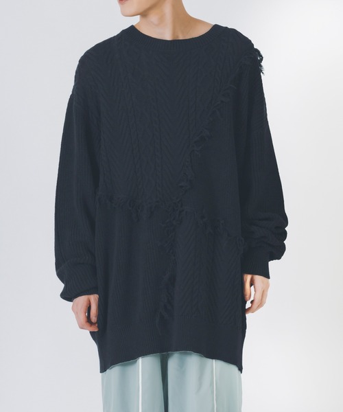 肌触りが優しく年中使えるコットン素材のニット -detail- 甘めの編み地でオーバーサイズなゆとりはそのルーズ感が今風。 ケーブル編みと天竺編みの切り替え部分に 大胆なフリンジを残しているのが特徴。 -fabric- 綿100%で地肌に着ても優しく、 夏にサマーニットとして着ることも可能。 -styling- どんなボトムとも着回しできますが、 オーバーサイズでややだらしなく着るのがオススメ。 太めのワイドパンツで全体をゆったり見せるのもあり、 トラックパンツなどで柔らかい素材で まとめてモードな雰囲気を演出してもクールです。 【RE730】(SEVEN THIRTY) 流行に敏感な世代に向けた、 ジェンダーレスなストリートファッションを発信するブランド