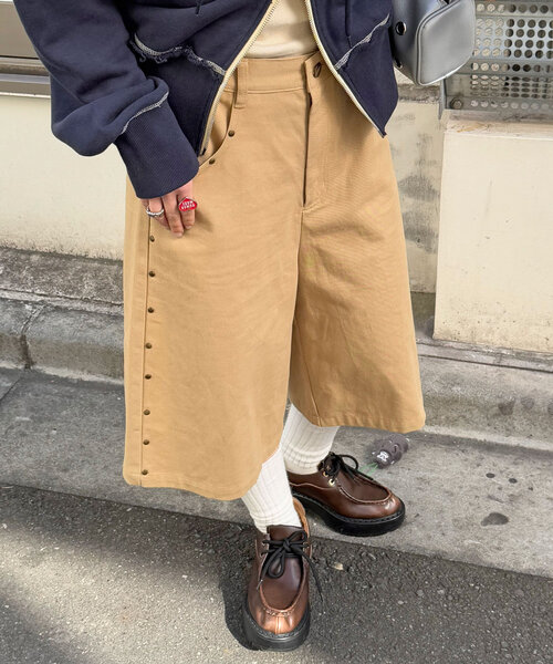 スタイルアップもトレンド感もばっちり!「スタッズディテールハーフパンツ」登場! ▼ポイント 緩やかに広がるAラインシルエットが美脚効果を演出し、股上深めのデザインでハイウエストスタイルも自在! 背面のウエストゴムでラクに履けて一日中快適♪ さりげないスタッズディテールがコーデを格上げして、簡単におしゃれ上級者に。 カジュアルもストリートも、この1枚で幅広いスタイルを楽しめる万能アイテムです。 ▼スタイリング シンプルなクロップド丈トップスを合わせて、Aラインシルエットを主役に。 足元はショートブーツで大人っぽさをプラスし、シルバーアクセサリーで統一感を出すのがおすすめ。 --------------------------------------------------- 透け感:なし 伸縮性:あり(ウエストゴム) 裏地:なし 光沢:なし --------------------------------------------------- 家庭洗濯:40℃限度/手洗い可 タンブル乾燥:不可 アイロン:低温110℃まで※スチームなし クリーニング:石油系溶剤による弱いドライクリーニング可、非常に弱い処理によるウェットクリーニング可 --------------------------------------------------- ※着用、お取り扱いの際は、商品についている品質表示とアテンションタグを必ずご確認下さい。 ※画像の商品はサンプルです。実際の商品と仕様、加工、サイズが若干異なる場合がございます。 ※可能な限り実物に近いカラーにて掲載していますが、撮影環境やモニター環境などにより製品と画像のカラーがやや異なって見える場合もございます。予めご了承ください。 【お買いものをよりお楽しみいただく為に!!】 ▼商品のお気に入り登録(ハートマークをクリック) お気に入りアイテムの完売カラーの再入荷通知や、ラスト1点の通知、セールの通知も受け取ることができます。 ▼ブランドのお気に入り登録 新商品や再入荷、クーポン配布などのお得な情報を受け取ることができます。