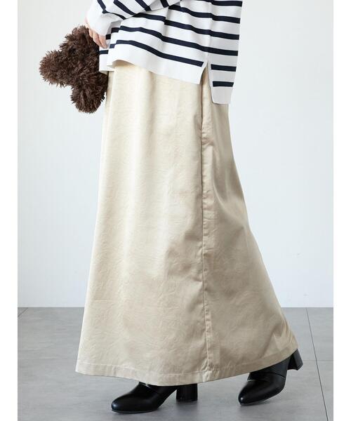 独特な表面感と美しい光沢が魅力のエンボスサテンスカート。広がりすぎないタイトめのロングシルエットで、品よくスタイリングすることができます。ウエストは後ろゴムギャザー仕様になっているのもポイント◎裾スリットによって足さばきもスムーズで着用しやすいです。普段使いはもちろん、仕事や休日のお出かけにと、幅広く活躍してくれます。※商品画像は、撮影環境やお客様のご利用のPC・スマートフォンのモニター環境などにより実物と色味に差異がある場合がございます。【その他採寸】F ウエスト:[後ゴム仕様]67cm