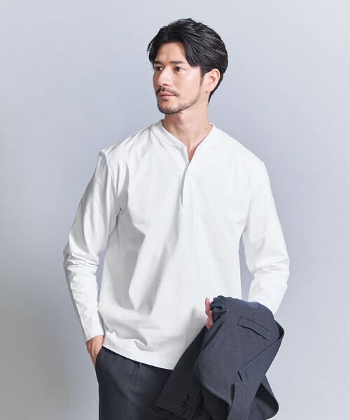 WEB限定 WARDROBE 『SMART』 大人が求める¨スマートなルックス¨、¨快適な着心地¨の両立に拘ったワードローブ=SMART。アイテムごとに適した最適なシルエット。快適さに拘った機能的なファブリック。 大人が求める要素がいい塩梅で調和した新感覚のワードローブです。 嫌なにおいを抑制する アンチバクテリア&デオドラントシリーズ(抗菌・防臭)スキッパーヘンリーネックTシャツの長袖版が登場 ■デザイン 程よくフィット感のあるスリムシルエットです。 人間の腕の形状に合わせて袖山も高くし、少し前振りの袖付けなど、自然とすっきり見えるパターンに拘りました。 台衿にボタンがなく、見た目がスッキリ見えるのが一番のポイントです。 また前立ては胸元が開きすぎない絶妙なバランスにして、スキッパーの抜け感を保ちつつ、こなれた表情感を演出します。 ジャケットやアウターのインナーに合わせても様になるように意図しました。 ■素材 程よい肉感があり、一枚でも着れるきれいめ天竺を使用。 糸の段階で毛羽を焼いているので品の良い微光沢感があり、生地に抗菌防臭加工を施すことでTシャツに付きもののニオイの原因菌にも効果を発揮し、嫌な臭いを抑制します。 ■コーディネート スマートにインナーや一枚着として着こなせるスキッパーヘンリーネックTシャツです。 ジャケット合わせでの相性も良くお仕事用の一枚着でもおすすめできるアイテムです。 ご家庭での水洗い洗濯が可能です。 同素材で、モックネックTシャツもご用意しています。 (対象品番:12121058569) ============================ 裏地:なし 透け感:なし 生地の伸び:適度な伸縮あり 光沢感:なし 機能性:抗菌防臭 ケア方法:洗濯機洗い可・ドライクリーニング ============================ 【注意事項】 ※商品を使用前に、タグ等に記載されている「取り扱い上の注意書き」、「洗濯表示」を必ずご確認ください。 ※商品画像は、光の当たり具合やパソコンなどの閲覧環境により、実際の色味と異なって見える場合がございます。予めご了承ください。 ※商品の色味の目安は、商品単体の画像をご参照ください。 ※画像の商品はサンプルです。 お問い合わせの際は、ユナイテッドアローズ カスタマーサービスデスクまで下記の品名/品番をお申し付け下さい。 品名:byS CLR GAS CTN JK/HL LS 品番:12121058726