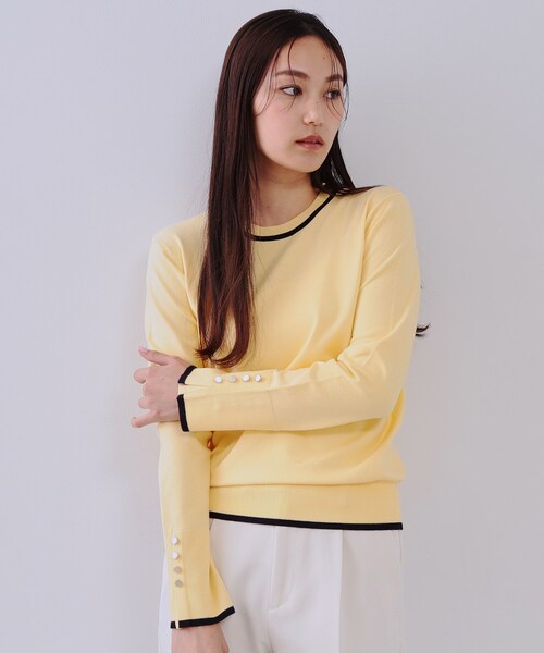 【デザイン】 ・ベーシックなボディに、衿ぐり、袖口、裾に配色のライン使いを施したデザインニットプルオーバー ・袖口はスリット使いのリブ仕様で、さらに金ボタンをアクセントに付けています。 ・同素材で、ニットカーディガン(637-32003)とのアンサンブルでの着用もおすすめです。 ・きれいめにオフィススタイルでも、デニムなどでカジュアルなスタイルにも幅広くおすすめです。 【カラー】 ・イエローベース×ブラックライン(031) ・ライトベージュ×ブラックライン(051) ・ネイビーベース×ライトベージュライン(094) 【素材】 ・キレイな表面感と滑らかな肌触りのレーヨン/ナイロン素材を使用 ・マシンウォッシャブルでご自宅でのお洗濯も可能 ※照明の関係により、実際よりも色味が違って見える場合があります。また、パソコン・スマートフォンなどの環境により、若干製品と画像のカラーが異なる場合もございます。 モデル情報:身長167cm B84 W62 H88 着用サイズ:38(M) 店舗へのお問い合わせ商品番号:637-12011 ●製品寸法: 36(S):着丈53cm B84cm 袖丈55cm 肩幅33cm 38(M):着丈54cm B88cm 袖丈55cm 肩幅34cm 40(L):着丈56cm B92cm 袖丈56cm 肩幅36cm 42(LL):着丈58cm B96cm 袖丈57cm 肩幅38cm 備考: