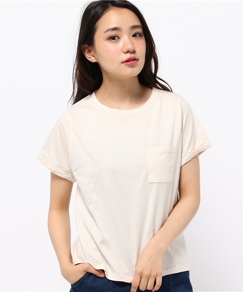 who's who Chico(フーズフーチコ) 人気のポケットTシャツから新色登場♪ 胸元のポケットやラフにロールアップしたような袖口のディテールがポイントのTシャツです。程よくゆとりのあるシルエットは、やや短めの裾丈ですっきりとまとめ、ルーズにならないように仕上げました。デイリーユースにぴったりのアイテムです。