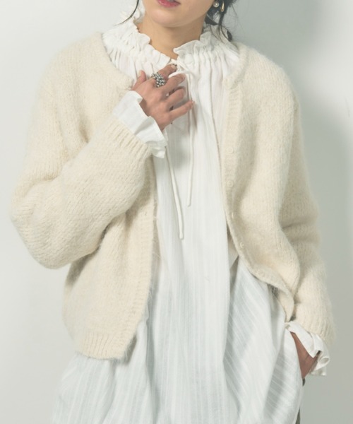 カジュアルな雰囲気になりすぎず大人なラフスタイルを作り出す 柔らかなウール混糸で編まれたニットカーディガン ■styling ・ボリュームのあるサーカスパンツから綺麗めのスラックスまで カジュアルからきれいめスタイルまで幅広いボトムスと合わせて着ることができます。 ・襟や袖口からシャツやフリルをのぞかせて シャツやフリルトップスなどとのレイヤードコーデもおすすめ。 《point》 ・様々なボトムスとバランスよく着られるやや短めのジャスト丈 ・スキッパーデザインで首元の抜け感を演出 ・華奢で小ぶりのボタンで女性らしさもプラス 《detail》 ・ウエストインせずにバランス良く着こなせる着丈 ・ドロップショルダーで程よくゆとりあるサイズ感 《fabric》 ・ちくちくせず快適な着心地。 ・分厚すぎずアウターの下でももたつかない ・ウール混でしっかりあたたかい 素材 アクリル62%, ナイロン18%, ポリエステル11%, ウール8%, ポリウレタン1% サイズ 身幅:52cm 肩幅:56cm 着丈:51cm 袖丈:56cm …………………… 透け感 : なし 厚さ:厚手 伸縮性:あり 裏地:なし お取り扱い上のご注意: 手洗い ✖ 詳しくは付属の「お取り扱い上のご注意」をご確認ください。 素材編地の特性上、1着1着、サイズのばらつき、風合い、色合い等が微妙に異なりますので予めご了承ください。 濃色のものは多少色落ちしますのでお洗濯の際は淡色のものとは別にお洗いくださいませ。 …………………… ※ご注意※ ・屋外の光や照明の当たり具合で、実際の商品の色味とカラー別画像の色味に若干の違いが発生する場合がございます。 ・詳細画像と併せてご確認の上、ご注文いただきますようお願い致します。 【 Libra Cue 】 “包み込むような気持ちよさを” 快適で豊かな生活を送りたい そんな暮らしの”きっかけ”となるデイリーウェアをご提案します 【 商品のお気に入り登録 】 完売カラーの再入荷通知やラスト1点の通知プライスダウンの通知も受け取ることができます。 【 ブランドのお気に入り登録 】 新商品や再入荷など、ブランドの情報をいち早くお知らせします。 ※ご注文いただいた予約商品のお届け時期の確認は、注文履歴ページより行えます。