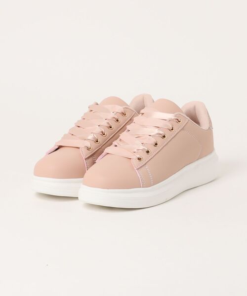 サテンのレースアップスニーカーで、かわいいコーディネートと相性抜群! 踵のグリッターで、後ろから見てもかわいくアクセントになっています。 ■対応サイズ表 S 22.0cm~22.5cm M 23.0cm~23.5cm L 24.0cm~24.5cm LL 25.0cm~25.5cm ※対応サイズ表は目安となります。