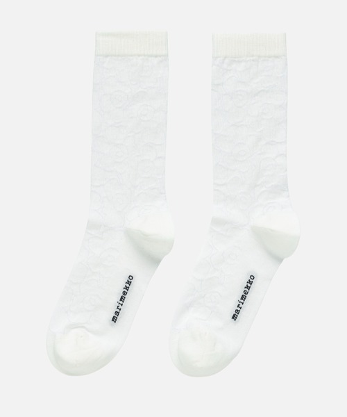【テキスタイルデザイン:Maija Isola(マイヤ・イソラ)】 Piirto Unikko(ピィイルト ウニッコ):ドローイング・ウニッコMarimekkoを代表するUnikko柄のセミロング丈ソックス。Unikko柄をラインで表現したスタイリッシュなデザイン。履き口にはリブ編みのアクセントでズレ落ちにくい仕様。様々なコーディネートにマッチするシンプル&モダンなデザイン。デイリーからお出かけまで幅広く活躍するアイテムです。※商品ひとつずつの柄の出かたが異なるため、表示画像のディテールと多少異なるデザインのものが届く場合がございます。予めご了承ください。《サイズ》※サイズは目安です。参考までにご覧ください。34(34-36) 22.0-23.0cm37(37-39) 23.5-25.0cm40(40-42) 25.5-27.0cm 43(43-45) 27.5-29.5cm 46(46-48) 30.0-32.0cm