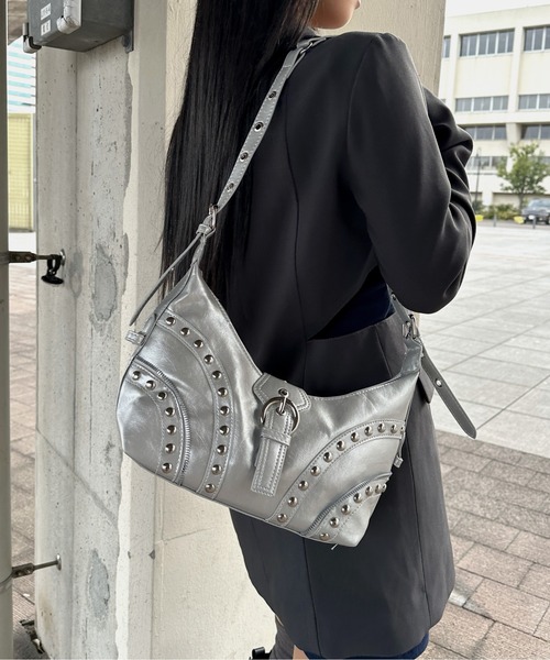 【LVEU.】スタッズデザインハンドバッグ / バッグ BAG かばん ショルダー ワンショルダー スタッズ フラップ ジップ ファスナー 横長 ハンドバッグ ブラック シルバー