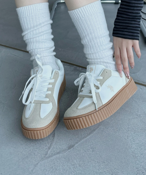 デザイン性と機能性のいいとこどり☆ デイリーに使いこなせる♪U.S. POLO ASSN. ローカット 厚底 スニーカー ★大好評につき新色/新サイズ追加★ メンズ対応サイズが仲間入り♪ ◆さらに大好評につき新色が登場◆ 甘くなりすぎないこなれピンクが仲間入り! ■商品の特徴 厚底ソールデザインのトレンド感の高いスニーカーが人気ブランドU.S. POLO ASSN. から登場☆ ブランドアイコンの刺繍とスエード調のオーバーレイのデザインがカジュアルな中にクラシカルな雰囲気を添えてくれる1足 さりげなくスタイルアップしてくれるソールは表面に凹凸があり、レトロな印象もプラスしてくれて、 カジュアルなスタイリングのみならずさまざまなテイストにお使いいただける着回し力の高いアイテムです♪ ■Point ・スニーカー ・厚底スニーカー ・バイカラーデザイン ・スウェードタッチ ・刺繍入りでアクセントに ・疲れにくいソールでデイリーに着用可能 ・通勤 ・通学 ・お出かけ ・ローカット ============= ◆サイズ選びに困っていませんか? \スタッフが試着してみました!/ ▼Rさん/ 普段サイズ:23.5cm 選ぶサイズ⇒24.0 ゆるい ☆★☆☆☆ きつい 全体的に少しだけ緩め、ピッタリが苦手だから24.0cmだけど、ピッタリ履きたい人は普段サイズでいいと思います。 ▼Sさん/ 普段サイズ:24.5cm 選ぶサイズ⇒24.5 ゆるい ☆☆★☆☆ きつい 全体的にぴったりで軽くて履きやすかったです。 ※足の形には個人差があります。スタッフ試着感想は参考程度にお考え下さい。 ■素材・混率 …………………… 合成皮革 100% …………………… ■サイズ情報 …………………… 22.5cm ヒール高さ:38mm 足幅:90mm 23.0cm ヒール高さ:38mm 足幅:91mm 23.5cm ヒール高さ:38mm 足幅:92mm 24.0cm ヒール高さ:38mm 足幅:93mm 24.5cm ヒール高さ:38mm 足幅:95mm …………………… ■コーディネート ・ゆるっとしたスラックスや、デニムの足元から覗かせて足元にさりげなくアクセント★ ・ルーズソックスなど厚手の靴下と合わせてミニ丈ボトムとコーディネートすると韓国ライクな印象に♪ ・ふんわりとしたフレアスカート×スウェットの古着風コーデにも相性抜群◎ ■ブランド紹介 【U.S.POLO ASSN ユーエスポロアッスン】 U.S.POLO ASSN.(ユーエスポロアッスン)とはUnited States Polo Association(ユーエスポロアソシエーション)の略で、全米競技ポロ協会に認定された唯一のブランドです。 アメリカ唯一のPOLO競技のオフィシャル団体として1890年に設立されました。米国を中心にバッグやアパレル、腕時計他幅広い商品展開を行っており、世界150カ国、公式ショップ1000店舗以上で販売が行われています。 ■SNS情報 【公式 Instagram】 @__ada.official__ 新着アイテム&トレンドアイテムを毎日発信中♪ お洋服好きなおしゃれなアナタはフォロー必須...♡ 【公式 TikTok】 @ada._official コーデのおたすけちゃん 真似しやすい垢抜けコーデを毎日更新中♡ ■お気に入り登録 ★《お気に入り登録》でお得な情報がいっぱい★ ・「商品のお気に入り登録」で再入荷通知や、ラストの通知、セール通知も受け取ることができます ・「ブランドのお気に入り登録」で新商品や再入荷など、お得な情報を受け取ることができます! ※商品画像は撮影時の光や角度により、実物の色味と異なって見える場合がございます ※撮影はサンプル品を使用しており、表示のサイズ感も実物とは若干異なる場合もございますので、予めご了承ください ※生産時期により色・素材・サイズ感など多少異なる場合がございます。予めご了承ください ※他のキャンペーンにより、期間中に価格が変動する場合があります ※セールは予告なく終了させていただく場合もあります。 ※他のキャンペーンにより、期間中に価格が変動する場合があります。※セールは予告なく終了させていただく場合もあります。