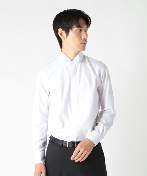 【洗練された美しさと快適さを兼ね備えた、特別な日のための一着】上質なフランス綾ツイル素材を使用した、細身のラインがエレガントなウィングカラーシャツ。【デザイン/素材】コットンとポリエステルを組み合わせたフランス綾ツイルを使用。滑らかな肌触りで上品で落ち着いた印象を与える素材、高級感ある質感が魅力です。目がたったツイルで伸縮性もあり、動きやすくストレスレスな着心地を提供します。【シルエット】ウエストに軽く絞りを入れ、細身でスタイリッシュなシルエット。スリムフィットなラインが美しい印象を与え、洗練された上品なデザインに仕上がっています。【ディテール】ウィングカラーの衿デザインが、フォーマルでありながらも現代的な雰囲気を演出。結婚式やパーティーシーンなど、特別な場面でも活躍する一着です。※照明・光の加減、PCやスマートフォンなどの環境により、製品と画像のカラーの見え方が異なる場合がございます。※画像はサンプルのため、色味やサイズ等の仕様が変更になる場合がございます。※サイズは弊社規定の採寸によって記載しておりますが、若干の個体差が生じる場合がございます。