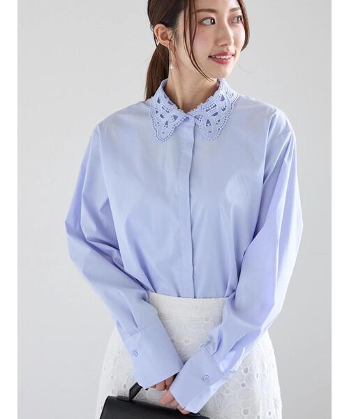 ケミカルレースが施された襟元が上品な雰囲気を演出するブラウス。 サイドに大胆なスリットをあしらっており、抜け感のあるスタイリングを楽しめます。 ボタンの見えないフライフロント仕様ですっきりとした印象に。 ボトムスにタックアウトしたきれいめなコーディネートがおすすめです。 ※商品画像は、撮影環境やお客様のご利用のPC・スマートフォンのモニター環境などにより実物と色味に差異がある場合がございます。 【その他採寸】 F 着丈:[前]65cm[後]71cm