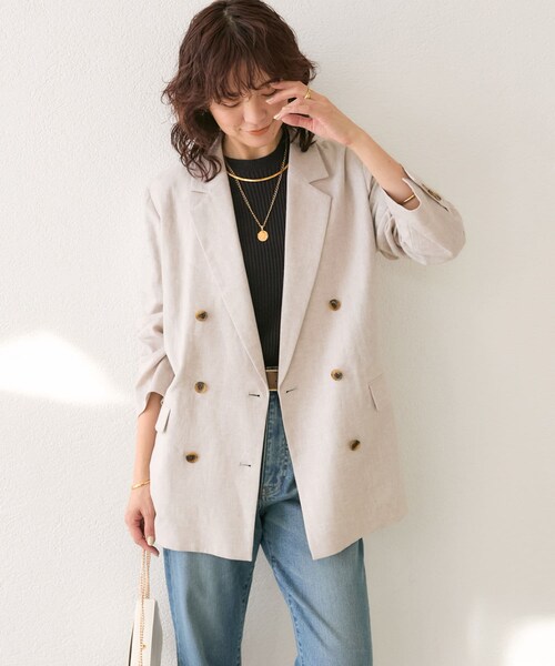 サッと羽織って様になるジャケット●デザイン正統派の6つボタンのダブルブレストジャケットを、ヌケ感のあるシルエットにデザインしました。肩はやや広めのセットイン。パット無しのなだらかなショルダーラインで窮屈感なく着用できます。程よくオーバーサイズな作りで着丈も長め。ヒップ周りはしっかりカバーできるのに、スッキリ着やせして見える絶妙なサイズ感がポイントです。存在感のあるテーラーカラーと配色ボタンも引き締まった印象に。裏地は背抜きになっているので滑りがよく、インナーも着込みやすくなっています。リネンの風合いの良いところはそのままに、ポリエステルを複合した素材でシワになりにくく手洗いも可能。リネン特有の硬さが少なく清涼感があり、着込むほどになじんでゆくのが魅力の素材です。ブラックは千鳥チェック、ベージュはヘリンボン織になっておりスタイリングのアクセント付けにピッタリな1着です。●素材《表地》 リ ネン 53% ポリエステル 47% 《背裏》 ポリエステル 80% 綿 20%・さらっとした清涼感のある素材洗濯方法:手洗い可透け感:ややあり裏地:背面のみ途中まであり伸縮性:ややあり生地の厚さ:ふつう光沢:なしポケット:あり--------------------------------------------------------------------------------【注意点】※画像の商品は光の照射や角度、お使いのモニター環境により、 実物と色味が異なる場合がございます。※入荷状況により、お届け予定が前後する場合があります。※工場の生産の都合上、納期が変更になる場合がございます。検品や輸送の関係で、発送日が前後しますのでご了承ください。また、入荷状況により、お客様への発送が店頭販売より遅れる場合もございます。※追加生産商品は、一部の店舗、通販で販売中の場合がございます。 予めご了承下さい。※サンプルでの撮影、計測をしております。商品の仕様が一部変更になる場合がございます。※撮影サンプル品はブランドタグがついておりません。製品にはタグがつきますので、製品の表に縫い糸が見える場合がございます。--------------------------------------------------------------------------------【お買い物をもっと便利に楽しく♪】『♡』をクリックでお気に入り登録✓「商品のお気に入り登録」で・・・ラスト1点や再入荷の通知が届きます。登録して頂いた商品だけが対象となる、あなただけのタイムセールが開催されることも!✓「ブランドのお気に入り登録」で・・・新商品や再入荷など、いち早くブランドのお得な情報を受け取ることができますので、ご登録をおすすめします!--------------------------------------------------------------------------------