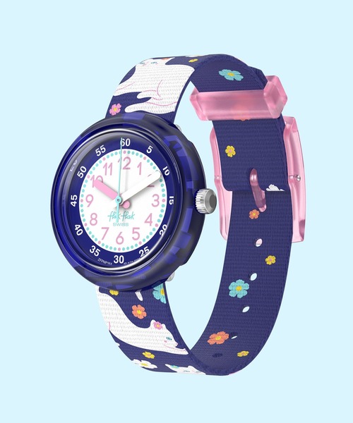Flik Flak (フリックフラック)は、子どもたちに時計の読み方を教える力となっているスイスウォッチです。 【Flik Flak (フリックフラック)について】 Flik Flak(フリックフラック)は世界中で愛されている、スイス製のキッズ腕時計です。キッズたちが時計を読めるように応援するをコンセプトで開発されており、魅力的で身に着けられる教材として設計がされています。 【品質と安全性】 ・耐久性:遊び場から洗濯機まで、あらゆる場所での厳しい環境に耐えるように設計されています。 ・品質管理:専用の品質管理ラボで1か月間の化学的・機械的なテストを実施 ・法規制遵守:世界各国の法規制を上回る品質基準とCPSIA認証を取得 ・有害物質不使用:100種類以上の有害物質を含まないことが保証 ・耐性:引っ張りやねじり、衝撃テストクリア。汗、プールの水、紫外線にも耐性があり ・環境配慮素材: 時計のケース、ループ、タン、バックルには、トウゴマから作られたバイオ素材使用。 ファブリックストラップにリサイクルされたペットボトルを使用。 ・エコパッケージ:完全にコンポスト可能な環境に配慮したパッケージ。 FANCY CATは、ネコ好きのキッズに最適なウォッチです! 教育的要素もあるので、子供が時計の読み方を学ぶのに役立ちます。 ダークブルーの背景と花柄のデザインで、素敵なギフトにぴったりです。
