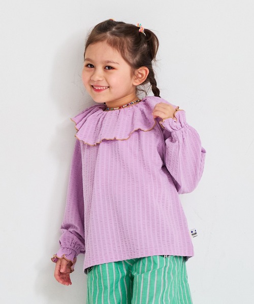 【大きなフリルカラーが印象的】 ■デザイン マーキーズの定番人気アイテム♪ ふんわりボリューム衿がガーリーな印象。 首元と袖口はゴム仕様にで、ふんわりとしたスタイルに。 メローの配色がコーデのアクセントになります。 ■スタイリング 1枚でコーデがキマる万能トップス! ロンTやスウェットとレイヤードして衿を出すと・・・ とっても可愛いガーリーコーデが完成♪ 親子でリンクコーデもオススメです。 ■生地感 柔らかいデコボコ表面感が特徴的なサッカー生地。 薄手で肌ざわりがよく伸縮性もあるので着心地バツグンです。 ++++++++++++++++++++++++ 透け感:少しあり 伸縮性:少しあり 生地の厚み:普通 裏地:なし ++++++++++++++++++++++++ ■ネームタグ付き ■リンクコーデアイテム おとなサイズ ・ニットサッカーフリルカラーカットソー:0010351102 ※モデルが着用している画像は、照明や日光などの撮影時の環境により実物と異なる色味になる場合がございます。 商品単体の平置き画像を実物に近いお色味になるよう努めておりますので、お色味のご確認は平置き画像をご参照くださいませ。 ※お使いのモニター環境によっても実物のお色味と異なって見える場合がございます。予めご理解の程よろしくお願いいたします。 ハートマークをポチッ! 気になる商品はお気に入り登録をお忘れなく! 商品のお気に入り登録をすると... [再入荷][残り1点][セール情報]を受け取れます。 MARKEY'Sをお気に入り登録すると... [新商品][再入荷]の情報をいち早く受け取れます。