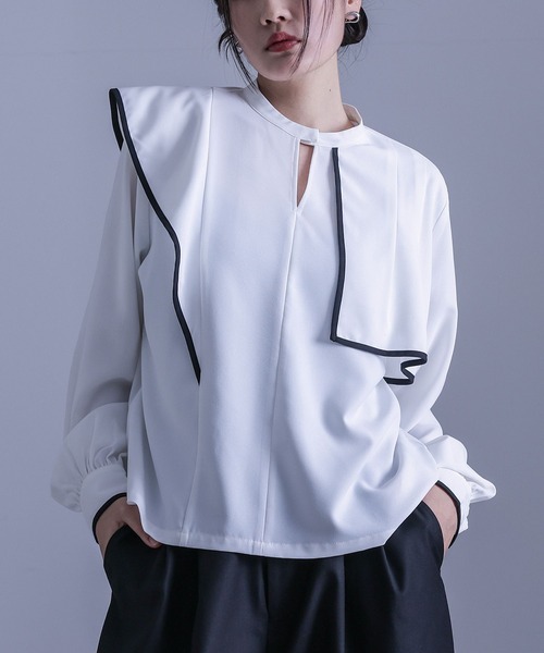 ■デザイン 配色パイピングがポイントになる、アシンメトリーデザインのブラウス。右肩のフリルと左肩のタック入りヨークで、どこから見ても動きのある個性的なデザインに仕立てました。 スキッパー襟はホック開きになっており、首元をすっきりと見せつつも着脱しやすい仕様に。 ウエストにインしやすいサイズ感もポイントです。 ■コーディネート 落ち着いた配色と、ひとクセありながらもシンプルなデザインでコーディネートに合わせやすいアイテム。 デザイン性のあるボトムスを合わせてモードやカジュアルに、シンプルなアイテムを合わせるだけでも洗練された印象に導きます。 普段使いはもちろん、オケージョンシーンにも活躍する一枚です。 ■素材 デザインが生きる、さらりと落ち感のある上品で綺麗めな素材感。 程よく風合いのある心地よい肌触りで、ロングシーズンご着用いただけます。