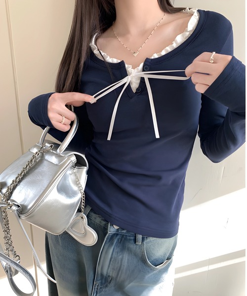 【ParAvionパラビオン 】〖Design〗 ・1枚で重ね着風の着こなしが出来るデザイントップス・首元のフリルとリボンがトレンドでバレエコアムードを高めてくれます・アウターを羽織っても胸元のリボンが見えてポイントになります・デニムと合わせればカジュアルなスタイルに、 スカートと合わせればガーリーに決まる1着です---------------------------------------------- 透け感: なし裏地: なし伸縮性: あり生地の厚さ:普通---------------------------------------------- ●商品のお気に入り登録 ♡をクリック!完売カラーの再入荷や残り1点の通知、お得なタイムセール通知も受け取ることができます。 ●ブランドのお気に入り 登録新商品や再入荷、セール、クーポン配布などお得な情報をいち早くお知らせします。ぜひご登録下さい! ●公式Instagram【@paravion_official】ZOZOに掲載してないコーデや入荷情報など随時更新しております。是非チェックしてみてください♪※ご注意※・屋外の光や照明の当たり具合で、実際の商品の色味とカラー別画像の色味に若干の違いが発生する場合がございます。・詳細画像と併せてご確認の上、ご注文いただきますようお願い致します。
