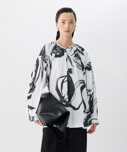 筆で描いたような繊細なフラワー柄が目を引く、スモック風ブラウス。襟元や袖にたっぷりと施されたギャザーが、柔らかくフェミニンな印象を演出します。肌に優しい素材で快適な着心地を実現。春先のコーディネートにぴったりの一着です。 JN79 5P2214730 #シャツ#ブラウス#白#ベージュ