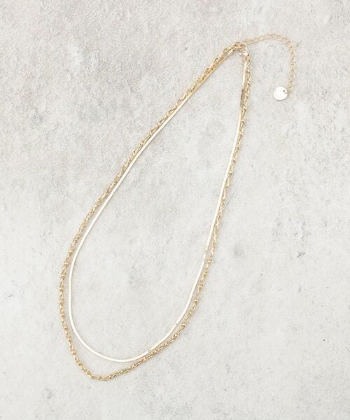 2種類のチェーンを重ね合わせた華奢な印象のネックレス 【デザイン】 ・異なるデザインの2連チェーンが作り出す重ね付けが魅力的。 スタイリッシュな印象を与え、単体でも存在感のあるアイテムです。 【着こなしポイント】 ・シンプルなトップスやドレスの上に重ねることで、華やかさをプラスできます。 カジュアルからフォーマルまで幅広く活躍し、コーディネートのアクセントになります。 ※照明の関係により、実際よりも色味が違って見える場合があります。また、パソコン・スマートフォンなどの環境により、若干製品と画像のカラーが異なる場合もございます。 店舗へのお問い合わせ商品番号:C71-32119 ●製品寸法: 00:全長37cm 幅0.4cm 備考: