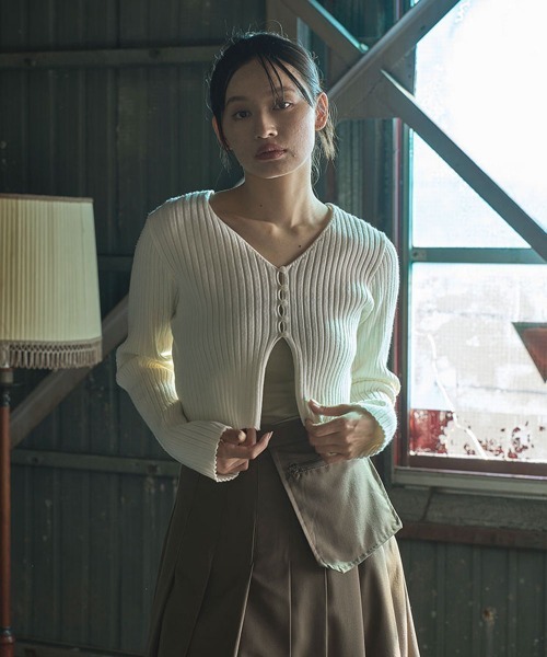 さっぱりとした質感で伸縮性のあるリブニット素材のカーディガンライクなトップス。ボタンが小さく連なったデザイン。短丈でボリューム感のあるゆったりとしたボトムと相性がいいです。パラシュートパンツやワイドパンツ、バレルレッグと合わせるのが特におすすめ。ハイウエストのスカートと合わせるのも可愛いです。トップスなのでジャケットの中に合わせたりしたレイヤードスタイルも。冬から春への季節の変わり目に。着心地が軽く、冬の重苦しさに不便を感じた時に。伸縮性もあり動きやすさも◎[着用時期]10〜4月(約20℃以下)[透け感]なし[生地の厚み]薄手[ストレッチ]あり[生地のやわらかさ]やわらかいがとろみなし[生地の特徴]さっぱりとしたリブニット素材[落ち感]なし(ふんわりしたシルエット)[着用ジワ]なりにくい[身長]全ての方に(身長によって着丈が変わります)※感じ方には個人差がございますので気になる部分がありましたらお気軽にお問い合わせください