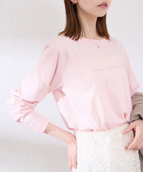 気楽に取り入れられるロゴロンT。【素材感】 ・廃棄予定の衣料品や残反等を回収し、新たに繊維にするサーキュラーエコノミーのRENU(レニュー)素材を使用。 ・肌にあたる側がポリエステルなので汗が表面に響きにくく、さらっとした感覚で着られる。 【デザイン・シルエット】 ・ドロップショルダーとゆったりフォルムで、旬のスタイルに仕上げたロングスリーブTシャツ。 ・アソートロゴプリントがポイント。 【カラー】 ・カラーによってロゴが異なります。 ブラック(01)ホワイト(10):「AVEC UNE DOUCE BRISE Je me sens bien」そよ風と気分が上がる ピンク(63):「Penser a' quelqu'un.」誰かに想いを馳せて 【スタイリングポイント】 ・ジャケットやVネックカーディガンのインナーとして、覗かせるのも一押し。 ・ピンクはホワイト系のボトムを合わせると爽やかな印象に。 ----------------------------- 裏地:なし 透け感:ホワイト(10)はややあり 伸縮性:ややあり 生地感・厚さ:やや薄手 季節:春・秋・冬(カーディガンやジャケットのインナーとしても◎) ----------------------------- ※撮影時の光、お使いのモニター環境によって色の見え方が違う場合がございます。 ※モデル身長:165cm 着用サイズ:38