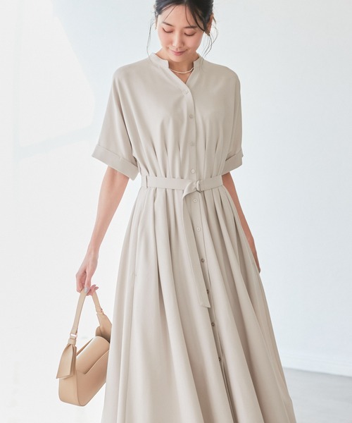 お出かけ着としてあると便利なシャツワンピース。【素材感】 ・サラリとした素材感。 ・リサイクルポリエステルを使用した、サステナブルなアイテム。 【デザイン・シルエット】 ・クラシカルなベルテッドタイプのシャツワンピース。 ・ウエスト周りは細かなタックを施して、メリハリの出るシルエットを演出。 ・袖はドルマンスリーブでゆったりと二の腕をカバー。 ・首もとに抜け感の出るVスリット入り。 【カラー】 ・ライトグレー、ベージュ、ネイビーの取り入れやすい3色をラインナップ。 【スタイリングポイント】 ・華奢なプチペンダントが映えるデザイン。 ・春先はビッグサイズのカーディガンなどを羽織って体温調整を。 ・きれいめなパンプス合わせできちんと感をアピールして。 <前回大人気だったシャツコンシャス半袖ワンピース(品番:GDE54050)との違い> ・前回よりカジュアル感が出て、お仕事だけじゃなく普段着にも使いやすいようにアップデート! ・表地を変更(ポリエステル 95% ポリウレタン 5%→ポリエステル 96% ポリウレタン 4%)。 ・前回袖が切替だったものを着物スリーブ(身頃と袖がくっついた状態)に変更。 ※上記に伴いバスト寸が大きくなっております。 ※ウエストの仕様や着丈は変更しておりません。 ・上襟なしに変更。 ・ヨーク切替なしに変更。 ----------------------------- 裏地:なし(ペチコート付き) 透け感:なし 伸縮性:ややあり 生地感・厚さ:普通 ポケット:あり ボタン:全て開閉可能 その他仕様:共布ベルト付き 季節:春・夏・秋 ----------------------------- ※撮影時の光、お使いのモニター環境によって色の見え方が違う場合がございます。 ※モデル身長:165cm 着用サイズ:38 : 【スタッフ着用レビュー】 ・身長148cm 骨格ウェーブ 着用サイズ:36 足首しっかり見える丈感で、低身長さんでも着用しやすいワンピースです! ベルト付きで、ウエストマークしてくれるのでスタイルアップもしてくれます。 ・身長156cm 骨格ストレート 着用サイズ:36 着丈は脛が隠れる長さです。 フィットアンドフレアのAラインデザインでシルエットがきれいです。 スカート型のペチコート付きなので透け感も気にせず着用できます。 ウエストベルトも取り外し可能です。 ワンピースでポケット付きなのも嬉しいポイントです◎ ・身長162cm 骨格ウェーブ 着用サイズ:38 ウエストのタックがシルエットをとても綺麗に見せてくれるデザインです。 袖口もぴったりとしないので、腕をすっきりと見せてくれます。 16cm38サイズの着用で、足首が出るくらいの長さでした。 ・身長164cm 骨格ナチュラル 着用サイズ:40 サラッとした肌触りで柔らかな着心地でした。 透け感を気にせず一枚で着用できます。ペチコート付きなので安心感がありました。 私の身長で40サイズ着用すると足首がしっかり見える程の長さでした。 身幅にゆとりがあり身体のラインを拾わず着用できます。 ウエストベルトで絞れるのできちんと感のあるシルエットです。