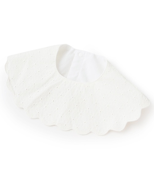 繊細なお花の刺しゅうとスカラップデザインが可愛らしいスタイです。 よだれをしっかりとガードする防水仕様となっています。 後ろの首元にはスナップボタンをほどこしており、簡単につけ外しが可能。 顔周りに華やかな印象を与えてくれるアイテムです。