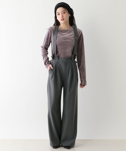 トレンド感たっぷりのシルエット! 2wayで着られるきれいめワイドパンツ! ■おすすめの着こなし ☆スポーツMIXな着こなしには・・・ カジュアルなロンTやスニーカーと合わせたスポーティーなスタイルがおすすめ◎ 定番キャップ合わせや、ニット帽と合わせてもトレンドライクに着こなせます! ☆大人きれいめスタイルには・・・ ベロアトップスやシアートップスなど光沢感のあるトップスと高相性◎ ミュール等と合わせることでこなれ感のあるスタイリングに! 小物でメリハリをつけても着映えします! ■ポイント ワイドシルエットで大人のこなれ感漂う、2wayサロペットが登場! 取り外し可能なサスペンダー付きデザインでスラックス単体としても着こなせます。 綺麗見えするTR素材なので、オフィスシーンでの着用も◎ ストンとまっすぐの落ち感が美しく、裾にたまるシルエットで脚長効果も抜群です! ウエスト部分は2タック仕様で仕上げ、腰回りのすっきり見えも叶います! 幅広いスタイリングとの相性がよく、様々なシーンで活躍します! ■素材 微光沢があり、ドレープ感のお洒落なTR生地。 上品な素材感でオンオフ問わず着用いただけます。 しわになりづらく、お手入れ簡単なのも嬉しいポイントです◎
