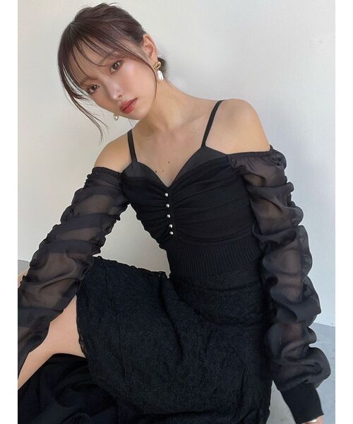デザイン性のあるニット ▽デザイン▽ ニットとシアーのドッキングアイテム。 見頃はボディにフィットするニット生地で細見えを叶えます。 バストはギャザーを寄せ小ぶりのパーツを付け高級感をプラス。 袖はギャザーをたっぷり入れたシアー生地で肌の透け感がポイント! オフショルデザインですっきりとした女性らしいアイテムに仕上げました◎ ▽カラー▽ 白・黒・青の3色展開。 ▽スタイリング▽ ボトムにインしたスタイリングがメリハリあるシルエットになりおすすめ! 1枚で女性らしく華やかな印象のスタイリングに仕上げます。 ※着用画像はフラッシュの加減で実際の製品と色味等が異なる場合がございますので、生地のズームアップ画像をご確認ください。 ※ご利用の端末画面の設定により実際の商品と色味が異なる場合がございます。 【商品特徴】 透け感:なし(袖あり) 伸縮性:あり 生地の厚さ:普通 サイズ感:普通 裏地:なし ポケット:なし