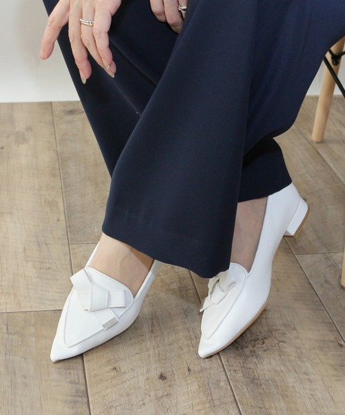 【Fin 2025Spring collection】 ■トレンドのリボンを足元から取り入れて■ アッパーのリボンが大人可愛いFin(フィン)のポインテッドトゥリボンローファーが登場しました。大きめのリボンとポインテッドトゥの掛け合わせは大人の女性も履きやすいバランスの取れた一足。ゴールドの金具をプラスして上品なデザインにアップデート。すらっとフォルムで女性らしさも忘れない優秀デザインは足元から一気にトレンドコーデに早変わり。 ■すらっとしたフォルムが足元をアップデート■ 中敷きの下には、低反発クッションをセットしているので足裏にも優しく、甲が深くホールド感があるので、脱げてしまう心配もなさそう。デニムやワイドパンツのカジュアルなスタイルのアクセントにはもちろん、スカートコーデやワンピースのフェミニンなスタイルにも相性◎。カラーによって雰囲気が変わるので、ご自分のスタイルに合ったお好きな一足をチョイスして。 ■低反発スポンジ入り(低反発スポンジを使用することにより歩行時の衝撃をやわらげます。) *低反発スポンジ・・・圧力を分散し、包み込む様なクッション感が特徴です。 スタッフによるサイズ感 ■普段のサイズ:24.0cm 足幅E(普通) ■着用サイズ:24.0cm ■感想:普段は24.0cmを履いていますが、素足やストッキング合わせでちょうど良いサイズ感です。ソックスを合わせても窮屈になることはなかったので、普段のサイズで問題ないと思います。シャープでスッキリしたシルエットですが柔らかい素材なので足当たりも良く、見た目以上に楽に履けます。甲が深めのデザインでしっかりとホールドしてくれたので、長時間でも安心して着用することができそうです。 ※上記は弊社スタッフの個人的な感想になります。お客様により感想が異なりますため、あくまで参考としてご覧下さい。 <サイズスペック> 22.5cm/アッパー幅:約13.2cm ソール幅:約7.6cm 重さ:約182g 23.0cm/アッパー幅:約13.4cm ソール幅:約7.7cm 重さ:約188g 23.5cm/アッパー幅:約13.6cm ソール幅:約7.8cm 重さ:約192g 24.0cm/アッパー幅:約13.8cm ソール幅:約7.9cm 重さ:約199g 24.5cm/アッパー幅:約14.0cm ソール幅:約8.0cm 重さ:約204g 25.0cm/アッパー幅:約14.2cm ソール幅:約8.1cm 重さ:約208g ・サイズスペックについてはFin独自の方法により採寸しております。 ・同一商品でも個体差が生じるため、採寸内容に若干の差が生じる場合がございます。