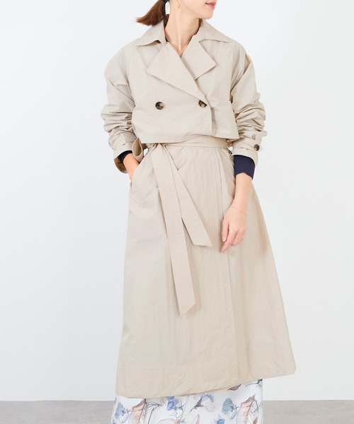 レイヤードしているようなデザインのトレンチ風コート。スポーティーになりがちな生地でタウンでも着やすいデザインに落とし込んでいます。ゆったりとしたシルエットで下に着るものを選びません。クラッシックなトレンチコートをシワなどを気にせずストレスフリーでご着用いただけます。カジュアルになり過ぎず日々のコーディネートに溶け込む便利なアイテムです。生地が弱撥水なので不安定なお天気にも対応できるのも嬉しいポイントです。【fabric】弱撥水のナイロン生地。ナイロン100%なのでシワになりにくい素材です。マットな質感です。--------------------------------------透け感:なし裏地:なし伸縮性:なし光沢感:なし生地の厚さ:普通-------------------------------------- ドライクリーニング*詳しくは商品の洗濯表示にてご確認をお願い致します。*商品画像はできる限り実物の色に近づけるよう徹底しておりますが、お使いのデバイスのモニター設定、お部屋の照明等の閲覧環境により実際の色味と異なって見える場合がございます。*画像の商品はサンプルです。実際の商品と仕様、加工が若干異なる場合があります。予めご了承くださいませ。