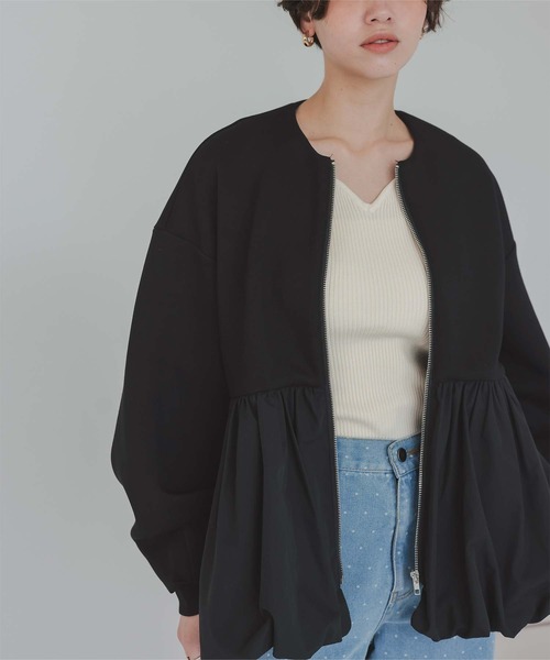 ドッキング素材を使ったペプラムシルエットのブルゾン。たっぷりとギャザーを寄せたシルエットが女性らしく、可愛さも感じさせるデザインに仕上がっています。■Point・ドッキングデザイン:ポンチ素材とシャツ素材をドッキングさせ、カジュアル感ときちんと感をバランスよく取り入れたデザイン。女性らしいシルエット:ギャザーをたっぷりと寄せたペプラムシルエットが、女性らしさを引き立てるデザイン。可愛らしさと大人っぽさを兼ね備えています。・ボリューム袖シルエット:ほんのりボリューム感のある袖シルエットが、全体のバランスを丸みのある優しい印象に仕上げてくれます。・体型カバー効果:体型を気にせず着られるデザインで、体型カバーをしっかりとサポート。おしゃれでありながら、気になる部分もカバーしてくれます。・素材の相性:切替部分にはしわになりにくいシャツ素材を使用し、上半身部分はポンチ素材を採用。カジュアル素材ときちんと見えする素材の相性が抜群です。■Coordination・カジュアルコーデ:デニムやスニーカーと合わせて、ラフでありながら女性らしさが引き立つカジュアルスタイルに。・きれいめコーデ:スカートやきれいめパンツと合わせて、上品さを演出するコーディネートに。・レイヤードスタイル:ワンピースやロングスカートと合わせて、レイヤードスタイルを楽しむのにもぴったりです。可愛さと上品さを兼ね備えたドッキングペプラムブルゾン。おしゃれで女性らしい印象を与えてくれるアイテムです。※当商品は機械による生産の過程上、どうしても"生地を織る際の糸の継ぎ目"や多少の"ほつれ"、他繊維の"混紡"、また、形やサイズや柄に多少の"誤差"が生じる場合がございます。※サイズは、実寸サイズを測っているため多少誤差がでる場合があります。製造工程の関係上、各採寸箇所実寸(平置き)より【約-3cm~+3cm】程度は誤差の許容範囲とさせて頂いておりますので、予めご了承くださいませ。※メーカーより密封状態で入庫し、検品時に再度袋詰めを行っておりますが、素材により染料等の臭いが強い場合がございます。※発送上の状態によって商品がシワになる場合がございます。※商品により色落ち・色移りがある場合がございますので、品質表示をご確認の上、お取り扱いにご注意くださいませ。【伸縮性】上部生地にあり【透け感】なし