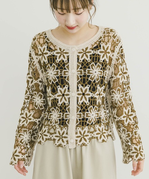 フラワーモチーフが施されたニットカーディガンは、今季注目のカギ編みデザインがポイント。コンパクトなシルエットで女性らしい上品な印象を演出します。ボタンを開けて羽織として着るのはもちろん、閉めてトップス感覚で着こなしても◎さまざまな着回しでロングシーズン楽しめるアイテムです。 【2025 Spring/Summer】【25SS】 総重量 : 約300g ※商品画像は、光の当たり具合やパソコンなどの閲覧環境により、実際の色味と異なって見える場合がございます。予めご了承ください。 ※商品の色味の目安は、商品単体の画像をご参照ください。 ▼お気に入り登録のおすすめ▼ お気に入り登録商品は、マイページにて現在の価格情報や在庫状況の確認が可能です。 お買い物リストの管理に是非ご利用下さい。 素材感 透け感 : あり 伸縮性 : なし 裏地 : なし 光沢 : なし ポケット : なし