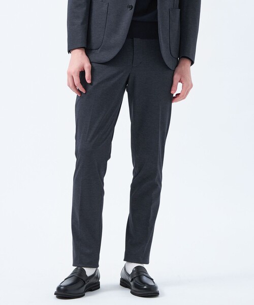 【2025年春夏アイテム TAILORED JERSEY】程良い肉感のジャージー素材を使用した半ゴムパンツ 【デザイン】 ベルトなしでも穿けるリラックスした着心地ながら前身はすっきりとした見た目のON/OFF兼用で着用可能なパンツ。裾にかけてテーパードを利かせてきれいなラインが出る設計にしています。 【素材】 一見無地に見えますが、グレーチドリ(#08カラー)とネイビーバーズアイ(#28カラー)の英国由来の柄をプリントで表現。タテヨコに伸縮性のあるジャージー素材を使用。程良い肉感の素材は微光沢、ヌケ感が見事に調和し、ビジネス・カジュアルどちらのスタイルにも最適です。 【機能性】 ウォッシャブル *同素材のジャケット(品番:H1E34541)の展開もございますので、セットアップとしても着用いただけます。 ジャージー素材のリラックス感とテーラードジャケットの上品さを併せ持つ「テーラードジャージー」。今の気分を取り入れたニューノーマルスタイルを提案するカテゴリーです。 【おすすめ着用ウエスト】 38サイズ:ウエスト78cm前後の方 40サイズ:ウエスト82cm前後の方 42サイズ:ウエスト86cm前後の方 44サイズ:ウエスト90cm前後の方 おすすめ着用期間:春/夏 ※サイズについては、仕様書のサイズを記載しており、多少の誤差が出る場合がございます。 ※この商品はサンプルでの撮影を行っています。 実際の商品とイメージ、仕様が異なる場合がございます。