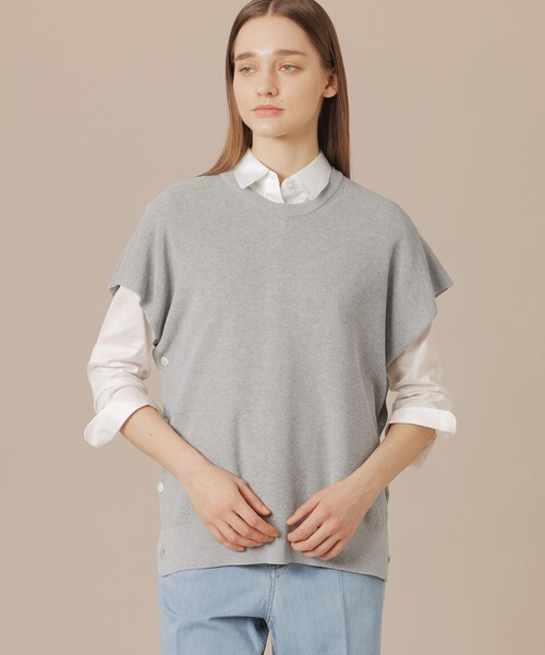 【ウォッシャブル】 1枚で様々な着方ができるニットベスト(ジレ)です。前身頃と後身頃をボタンで留めホールに頭を通せばベストになります。また、ボタンを前身頃同士、後身頃同士で留めホールに頭を通せばショルダーウォーマーになります。細く畳んでマフラーのようにも着用できます。コットンとアセテートで、肌触りが優しくさらりと清涼感があり上品な光沢もある仕上がりです。