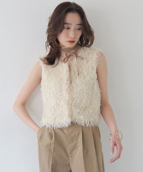<<<ふわふわ感が大人可愛いフリンジベスト>>> 【POINT】 ・コンパクトなサイズ感で幅広いボトムスとバランスよく合わせていただけます。 ・程よいボリューム感でデイリー使いもしやすく、軽量で羽織りやすい。 ・フェザーフリンジの素材は地が透け感のある生地になっているので、通気性も抜群。 ・衿のリボンはアクセサリー感覚で巻いて垂らしたり、後ろでリボン結びにしてもかわいい◎ 【STYLING】 ・ベーシックなスラックスやスカートでトップスを際立たせたスタイリングがおすすめです。 ・気温に合わせてインナーにシアートップスやTシャツをレイヤードしても着ていただけます。 ・前の釦を一つ開けてVネックのようにして大人っぽさを出した着こなしや、キャミワンピースの上から釦をすべて開けてベストとして着ても◎ 【FABRIC】 ◆透け感:少しあり ◆厚み:普通 ◆裏地:なし ◆伸縮性:少しあり ※撮影場所により、実際の色味と若干異なる場合がございます。 あらかじめご了承くださいませ。
