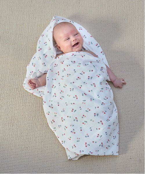 ベビーのお肌をやさしく包んでくれるおくるみです。 ガーゼ素材なので通気性が高いのがうれしいポイント。 一枚生地になっており、タオルとしても使用できます。 ナチュラルなカラーリングとキュートな総柄デザインが魅力です。