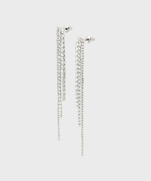 ビジューチェーンを使用したピアス。 長めのデザインは動く度に揺れ動く姿が素敵で、顔回りできらりと輝くラグジュアリーなデザインです。 華やかなドレスやシンプルなスタイリングにおすすめしたいアイテムです。