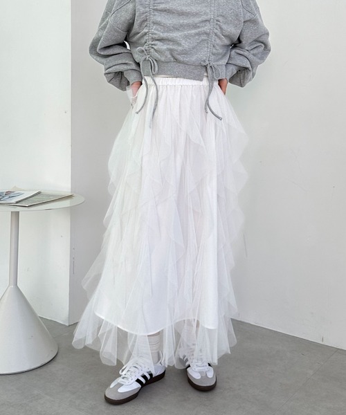 ■着映えロングスカート■ たっぷりのチュールが施された主役級スカート。 取り入れるだけでコーディネートに華が咲くアイテムです。 ウエストゴムで着心地抜群。 細かくタックが入っているので、 ボリューム感があり、ふわっとしたシルエットで女性らしい印象で着ていただけます。 すっきりしたトップスで着こなすスタイリングおすすめ♪ ーーーーーーーーーーーーーーー 透け感:オフホワイト若干あり 裏地:あり 伸縮性:ウエストゴム 光沢感:なし 生地厚さ:普通 洗濯方法:手洗い可 ※詳しいお手入れ方法は商品についているタグをご覧ください ーーーーーーーーーーーーーーー ※ご利用のモニター環境により、実際の色味と多少異なる場合がございます。 … information … 欲しいitemをお気に入り登録(♡マークをclick) ・お買いのがし対策…完売itemの再入荷やラスト1点の情報をお知らせ ・欲しいitemをお得にget…price downになったらいち早くお知らせ ・スムーズ検索…ZOZOのお気に入りアイテムページで簡単checkできるから、再検索不要♪