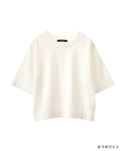 シンプルで合わせやすい無地プルオーバーがクロップド丈で登場。ドロップショルダーですが裾にダーツが入っているのできれいにまとまります。ワイドパンツやデザイン性のあるボトムとあわせるのがおすすめです。