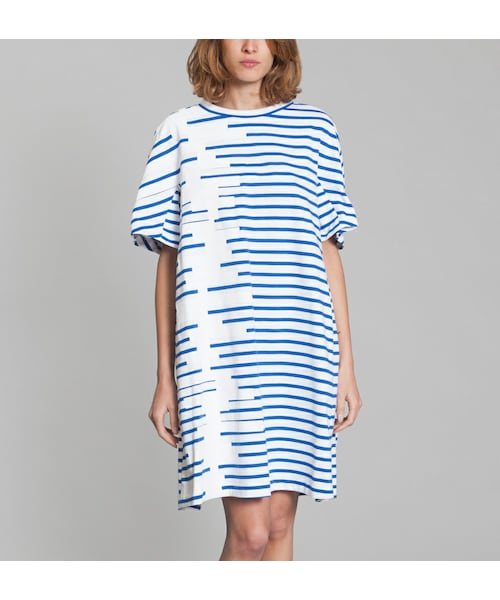 商品に関する質問はこちらにて、日本語にて気軽にお問い合わせ下さい。White cotton dress, delft blue sailor stripes with graphic effect at side, wide trapeze cut, round neck, 3/4 sleeves. Kenta Matsushige, winner of the Grand Jury Prize - First Vision 2014 International Festival of Fashion and Photography of Hyères, revisits the lines of the sailor shirt in an exclusive collaboration with Petit Bateau. Through this model, the designer takes the dress in a Japanese style and summery colours. Its trapezoidal volume is inspired by kimono and its stripes show the timeless sailor shirt, best-seller of Petit Bateau, under a new light. The result in an unstructured piece, particularly contemporary.