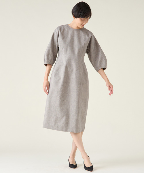 ≪デザインポイント≫ 全体的に切り替え部分でフォルムを出し、全面芯を貼ることでハリを出し、コクーンシルエットに作りこんだワンピースです。絶妙な袖丈で長い期間楽しむことができます。 ≪素材・着心地≫ リネンのナチュラルな天然感のある組織にラメを織り込んだ品のある素材感です。 ≪おすすめの着こなし≫ 一枚ですっきりと着るのがお勧めです。 透け感:なし 伸縮性:なし 光沢感:ややあり 裏地:なし 生地の厚さ:普通