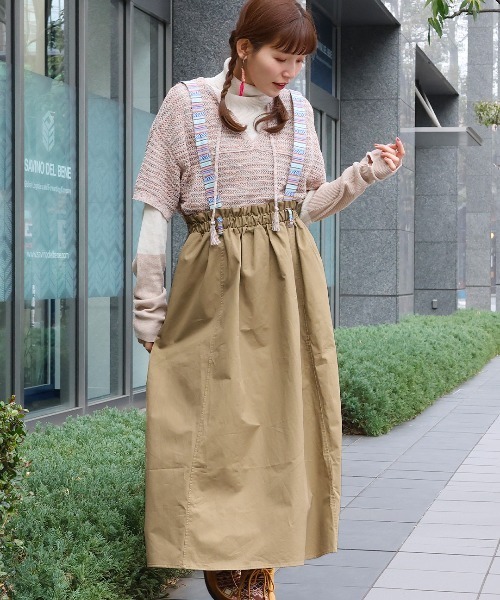 2種類の着方を楽しめるサスペンダー付きスカート ■デザイン サスペンダー付きのスカート、外してベーシックなスカートとしても着られる万能デザイン。 サスペンダーは無地と柄の面がありコーデによって変えて使うことができます。 カラフルな柄のベルトループもさりげないポイントです。 ハリ感のあるツイル素材が、ワーク感のあるカジュアルな着こなしに仕上がります。 ■サイズ感 レディースフリーサイズ ウエストはゴム仕様で伸びが良く、締め付け感が少ないです。 ■素材感 綿100%の丈夫なツイル素材を採用。 ■スタイリング チェックなどの柄シャツを合わせた、カジュアルなコーディネートに。 プルパーカーと合わせて、スポーティーにまとめるのもおすすめです。 ブラウスとの組み合わせなら、大人っぽく女性らしい雰囲気になりますよ。 ■カラー ブラック/キャメル ■お手入れ 洗濯機可 --------------------------------- 透け感:透けない 伸縮性:なし 裏地 :なし 光沢 :あり 生地の厚さ:普通 ポケット:あり --------------------------------- 【TITICACAのお買いものをお楽しみいただくために!】 ▼商品のお気に入り登録 完売カラーの再入荷通知や、ラスト1点の通知、セールの通知も受け取ることができます。 ▼ブランドのお気に入り登録 新商品や再入荷など、いち早くブランドのお得な情報を受けることができます!