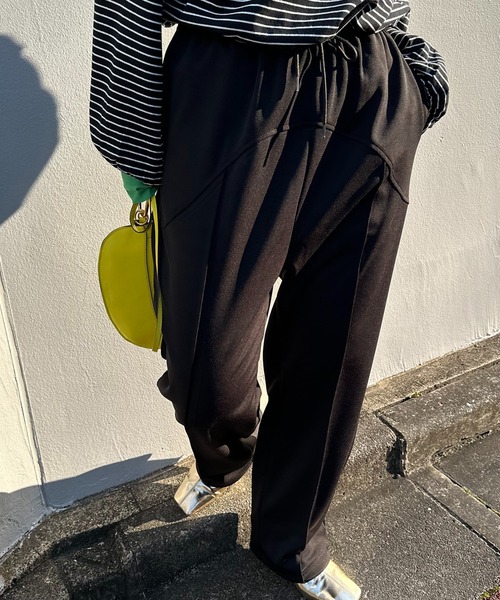 裾に配色ゴムのドロストがついて2WAY可能! カジュアル過ぎないから使いやすい、ポンチ生地のイージーパンツ テーパードのイージーパンツを、ストレッチが効いたポンチ生地で。 リラックス感があるのに、センターシームやシルエット、生地感で、ラフ過ぎないラウンジパンツです。 センタープレスでは無く、縫製を入れたピンタックデザインを施しているので、 イージーケアで、すっきり見えが叶います。 裾の内側に、配色ゴムのドロスト付き! ドロストにギャザーを寄せて、シルエットを変えての着用も◎ 配色ゴムを見せても、くるっと内側に結んでも! ドロストが内側についているので、ギャザーを寄せないで着用時にもスッキリ着用できます。 素材はストレッチ性があり、ウエストもゴム仕様。 ウエスト、ヒップまわりがゆったりサイズでストレスフリーな着用感。 ウエスト位置の調整で、丈感を調整できます。 裏地も無く、着用時もすっきり。 生地の厚みも程良くあるので、長いシーズン着用できる1枚です。 コーディネートに取り入れやすいカラー展開も魅力◎ ウエストゴム仕様でTOPSをインしても◎ トレンドのショート丈TOPSとの相性も◎ ロンTやスウェットなどの辛めアイテムと合わせて、こなれ感も◎ ヒールと合わせてキレイめコーデにも! ブラック ×配色ゴム:(ライム)イエロー ベージュ ×配色ゴム:ピンク ライム ×配色ゴム:水色 レッド ×配色ゴム:オレンジ ※レッドやブラックの濃色は、白や淡色のものと一緒に洗濯をしないでください。 また、着用時の摩擦にもご注意ください。 テーパードパンツ/イージーパンツ/ウエストゴム/イージーケア/オールシーズン/ピンタック/タックパンツ/春服/レトロ/コクーン/大人カジュアル/大人可愛い//テーパード/スラックス/カラーパンツ/配色/ジャージパンツ/スポーツMIX/スウェットパンツ/サルエル/モード/大人カジュアル/レジャー/センタープレス 【Information】 ◆《お気に入り登録》がオススメ◆ ・「商品のお気に入り登録」で再入荷通知や、ラストの通知、セール通知も受け取ることが出来ます。 ・「ブランドのお気に入り登録」で新商品や再入荷など、お得な情報を受け取ることが出来ます。 ※撮影時のライティング、ご覧になっているモニター・PC環境により、実際の商品と色味が異なって見える場合がございます。予めご了承をお願い致します。 ※他のキャンペーンにより、期間中に価格が変動する場合があります。 ※セールは予告なく終了させていただく場合もあります。