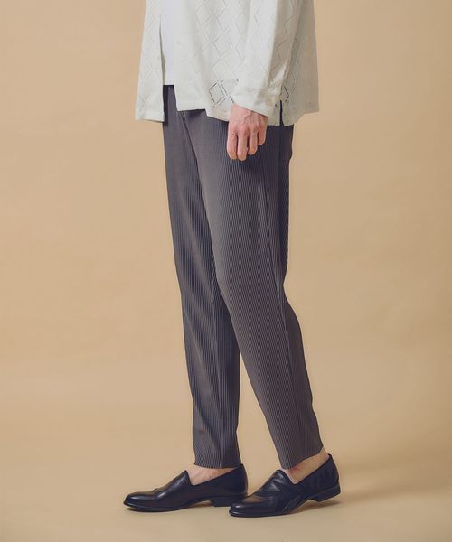 【素材】表面の凹凸が特徴のプリーツ生地を使用。キックバックに優れ、エアリーで快適な着心地の一枚。【デザイン】程良いリラックスシルエットが今の気分のプリーツパンツ。裾にかけてややテーパードしていてカジュアルにもキレイ目にも合わせられるイージースラックスです。【コーディネート】JK合わせからスウェットやニットなどのカジュアルスタイリングにも対応可能なイージースラックス。同素材でご用意しているカーディガン(品番:71509523000)とのセットアップもおすすめです。【AH ABAHOUSE】手ごろな価格でトレンドアイテムを発信するABAHOUSE GRAYのインライン。モードスタイルをベースに遊び心と自由な発想を取り入れ、”今”の気分を味わいながら日々のファッションを楽しみ、日常に溶け込むスタイルを提案いたします。チャコールグレー モデル:H187 B85 W79 H90 着用サイズ:48ブラック モデル:H181 W74 H87 着用サイズ:48
