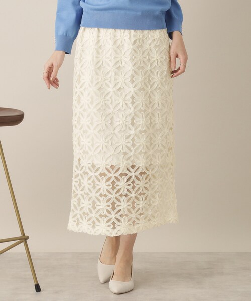 【デザイン】 オケージョンシーンにもOK。 立体的な花チュールが華やかで存在感ある一着。 デイリー使いはもちろんオケージョンシーンまで幅広く使えるセミタイトスカート。 立体的な花チュール生地はコーディネートに華やかなアクセントをプラスしてくれます。 シアー感のある素材を活かし、敢えて裏地差を付けて抜け感を出したデザイン。 後ろ裾にスリットを入れているので足さばきも◎ ウエストはゴム仕様なので着脱しやすくサイズカバー力もあります。 【素材】 立体的な花柄チュール素材。 チュール素材をベースに断ち切りのシフォンテープを花柄にたたきつけた生地です。 【仕様】 ・ポケットなし ・ウエスト総ゴム ・膝丈の裏地あり ※オフホワイト(003)はやや透け感があります。 ※照明の関係により、実際よりも色味が違って見える場合があります。また、パソコン・スマートフォンなどの環境により、若干製品と画像のカラーが異なる場合もございます。 モデル情報:身長171cm B80 W59 H88 着用サイズ:00(フリーサイズ) 店舗へのお問い合わせ商品番号:P93-62502 ●製品寸法: 00(フリーサイズ):W64~70cm H86cm 総丈86cm 備考: