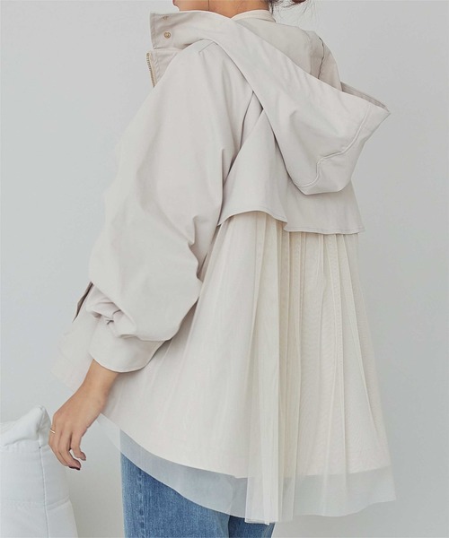 カジュアルなマウンテンパーカーに、バックチュールデザインをプラスした大人可愛い一着。 ■Point ・バックチュールデザイン:カジュアルなマウンテンパーカーの背面にチュールをあしらい、フェミニンで華やかな印象に。シンプルなアイテムでも、目を引くデザインが特徴です。 ・体型カバー&スタイルアップ:前後差のあるシルエットで、体型をカバーしながらもスタイルアップ。Aラインに広がるデザインで、女性らしいラインを作り出します。 ・Aラインシルエット:裾が広がるAライン調で、軽やかさと動きのあるスタイルに。カジュアルなデザインながら、フェミニンさもしっかりと取り入れています。 ・着回し力抜群:カジュアルにも、少しレディライクなスタイルにも合わせやすく、日常からお出かけまで幅広く活躍するアイテムです。 ■Coordination ・カジュアルコーデ:デニムやスニーカーと合わせて、軽やかで楽ちんなカジュアルスタイルに。 ・フェミニンコーデ:ロングスカートやワンピースと合わせて、女性らしさを引き立てるスタイリングに。 ・レイヤードスタイル:トップスとしても、羽織りとしても使えるため、寒い季節のレイヤードスタイルにもぴったりです。 オシャレでありながら、女性らしい魅力を引き立てるバックチュールデザインのマウンテンパーカー。 日常使いからお出かけまで、どんなシーンにも活躍してくれるアイテムです。 ※当商品は機械による生産の過程上、どうしても"生地を織る際の糸の継ぎ目"や多少の"ほつれ"、他繊維の"混紡"、また、形やサイズや柄に多少の"誤差"が生じる場合がございます。 ※サイズは、実寸サイズを測っているため多少誤差がでる場合があります。製造工程の関係上、各採寸箇所実寸(平置き)より【約-3cm~+3cm】程度は誤差の許容範囲とさせて頂いておりますので、予めご了承くださいませ。 ※メーカーより密封状態で入庫し、検品時に再度袋詰めを行っておりますが、素材により染料等の臭いが強い場合がございます。 ※発送上の状態によって商品がシワになる場合がございます。 ※商品により色落ち・色移りがある場合がございますので、品質表示をご確認の上、お取り扱いにご注意くださいませ。 【伸縮性】斜め方向に多少あり 【透け感】なし