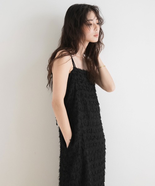 一枚で印象的♡ 洗練されたフリンジジャガード素材のキャミワンピース 【ディティール】 立体感のあるフリンジジャガード生地が上品で華やかな印象に。 ストンと落ち感のある女性らしいシルエットがさりげなく体系をカバー! バックリボンで丈感とウエストラインのフィット感をお好みに合わせて調整可能。 ゆったり着たい時も、メリハリをつけたい時も自由自在にアレンジしていただけます。 バックスリットを入れることでロング丈でも足さばきが良く動きやすさも確保。 裏地付きなので透け感も気にならず安心。 デイリーから特別なシーンまで着まわせる1着です。 【素材】 軽やかでソフトな肌障りの素材感。 【コーディネート】 シアートップスやカットソーと合わせたレイヤードコーデ。 1枚でキャミワンピとして着用しシャツやアウターを羽織るコーデもおすすめ。 インナーや足元、小物次第でカジュアルから上品スタイルまで楽しめる1着です。 ********************** 透け感:ややあり 裏地:あり 伸縮性:なし 光沢感:なし 生地の厚さ:薄手 **********************