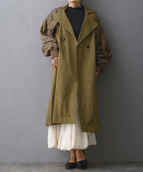 【MA-1ロングコート】【Fabric】コットン×ナイロンの異素材ツイル使い【Design】トレンドのMA-1の袖をトレンチコートのボディーにドッキングした仕様。袖と身頃で素材を変える事で程よいカジュアル感と、やぼったくみえるロング丈もすっきりとした印象になります。袖は取り外し可能なので、コーディネートの幅も広がります。【Styling】キレイメのコーディネートも羽織るだけでカジュアルダウンが叶います。逆にデニムやパーカーなどのカジュアルとあわせればおしゃれ上級者見え間違いなし。袖を取り外してジレっぽく羽織ってもおしゃれにきまります。-------------------------■透け感:なし■裏地:あり■伸縮性:なし■光沢感:なし■生地の厚さ:普通-------------------------☆★お買い物をお楽しみいただく為に★☆★商品のお気に入り登録完売カラーの再入荷通知や、ラスト1点の通知、セールの通知も受け取ることができます。★ブランドのお気に入り登録新商品や再入荷等、ブランドのお得な情報をいち早く受け取ることができます。