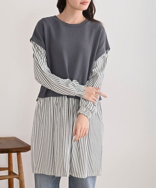 ☆2026/SS 再入荷☆ 着るだけでおしゃれ見えが叶うドッキングチュニック ロングブラウスにベストを重ねたようなレイヤードが1枚で楽しめるアイテム。 ストライプに無地のベストがメリハリのあるすっきりとしたデザインになっています。 ベストは柔らかでさらっと着られるニットソー。 袖口にはゴムが入っているのでたくし上げも楽にできます。 体型カバーにもなるチュニック丈。 ロンブーツやショートパンツと合わせてミニワンピとして着ても可愛いです。 裏地なし 伸縮性なし 薄手 ポケットなし 織キズやだま等みられる場合もございます 洗濯:洗濯機使用可(ネット使用) ※再入荷の場合、生産時期が異なるため色・素材・サイズ・デザイン等多少異なる場合がございますので予めご了承ください ▼お気に入り登録でお得がいっぱい▼ ~商品をお気に入り登録~ 再入荷・ラスト1点などの通知を受け取ることができます! ~ブランドをお気に入り登録~ 《rps》の新商品・再入荷情報をいち早くお届け!