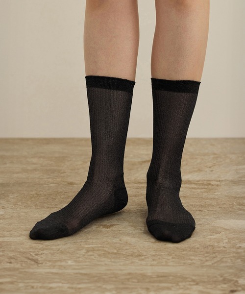 【素材】 極細番手のラメ糸を使用。 【デザイン・シルエット】 シアーな素材感に仕上げたハイソックスです。控えめなラメ感で上品に大人っぽく履いていただけます。 程よくテンションのある履き心地と、細リブデザインですっきりした印象に仕上げました。 とてもシアー感がある繊細な素材なので、春らしく足元に抜け感をプラスしてくれる1品。 つま先上部の縫い目を足底に持っていきごろつきがないスムースな仕上げになっているので、サンダルやオープントゥでもソリッドな美しいトゥ先が叶います。 【カラー】 ブラック、ホワイト、ピンクベージュ、3色展開 ※画像の商品はサンプルです。実際の商品と仕様、加工、サイズが異なる場合がございます。 ※撮影場所やライティング、お使いのモニター環境によって色の見え方が異なる場合がございます。 ※商品のカラーは画像の色味をご参照ください。